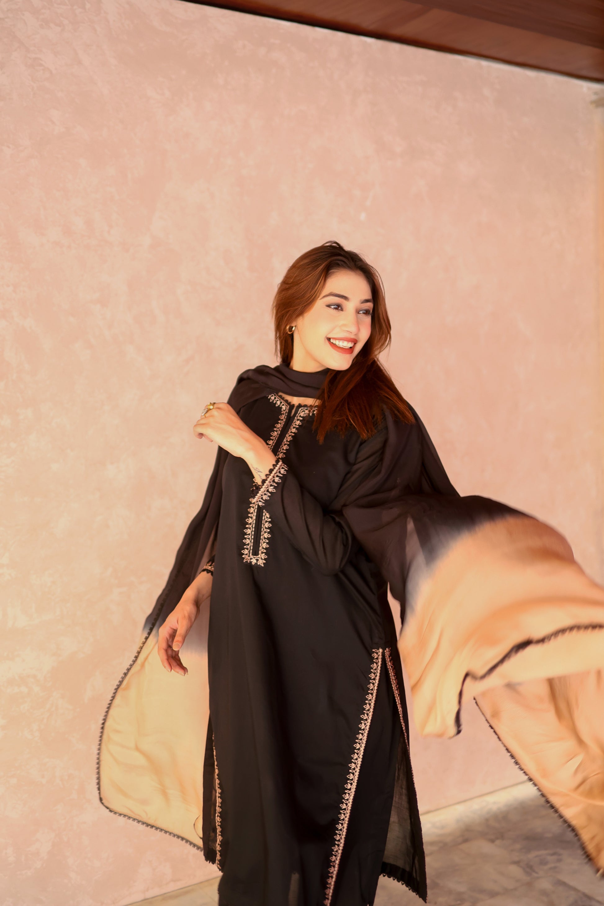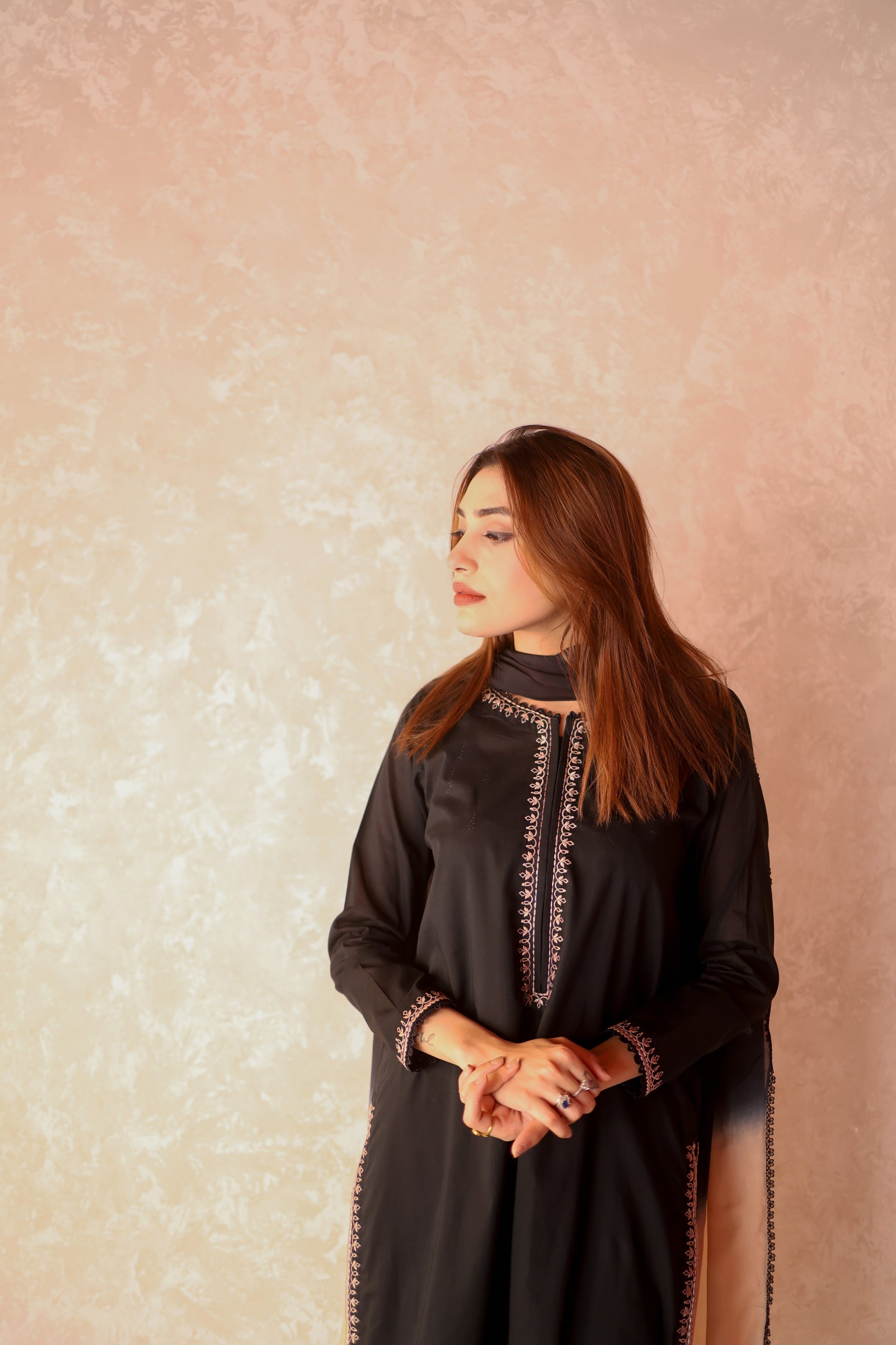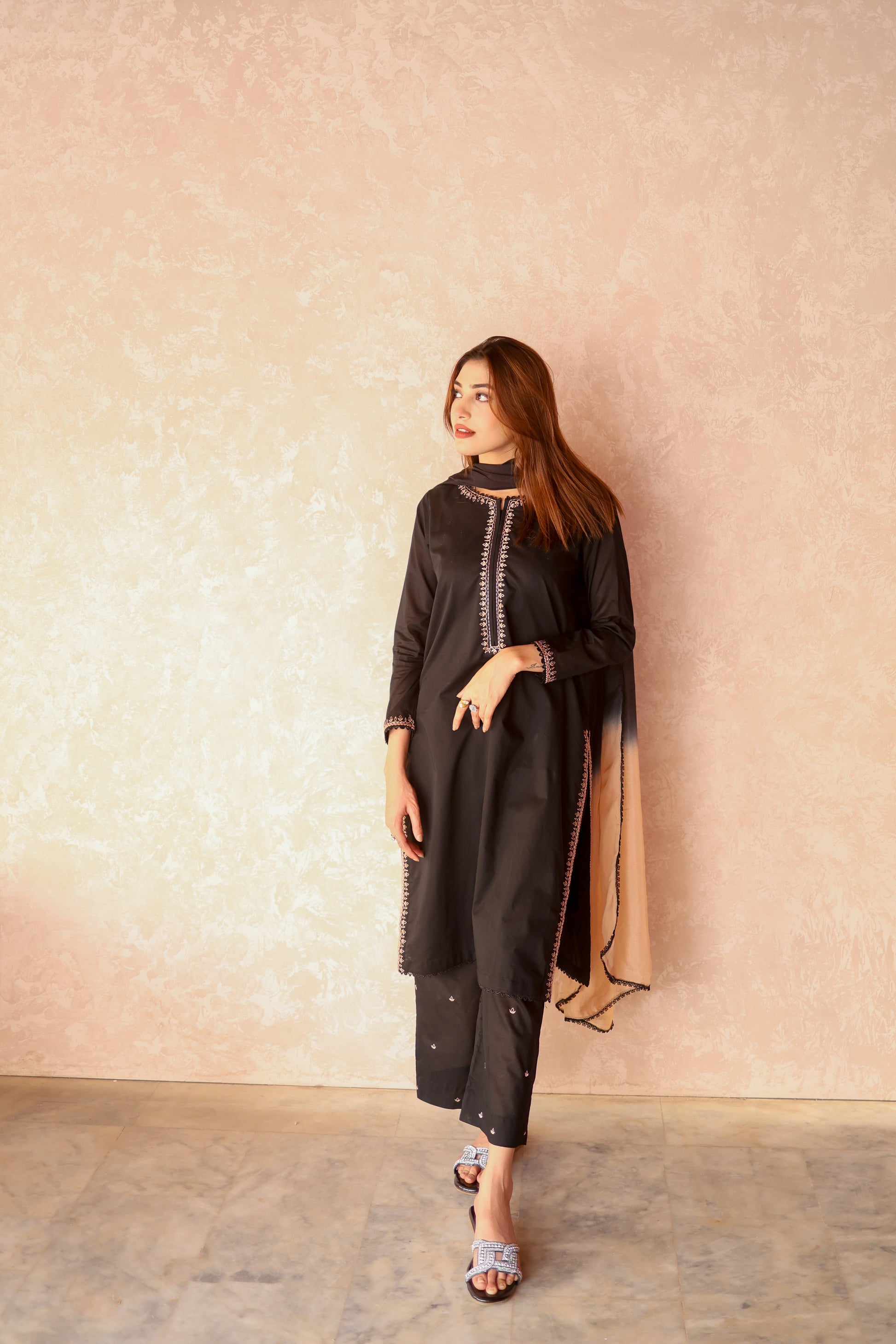 §qTurn heads in our elegant black straight shirt, delicately embroidered along the neckline and sleeves. Crafted from soft Premium Lawn, it's paired with a matching trouser and a tie-dyed medium silk dupatta that adds a vibrant, graceful finish.