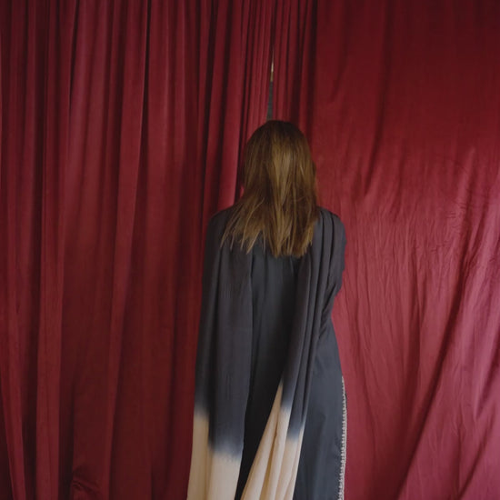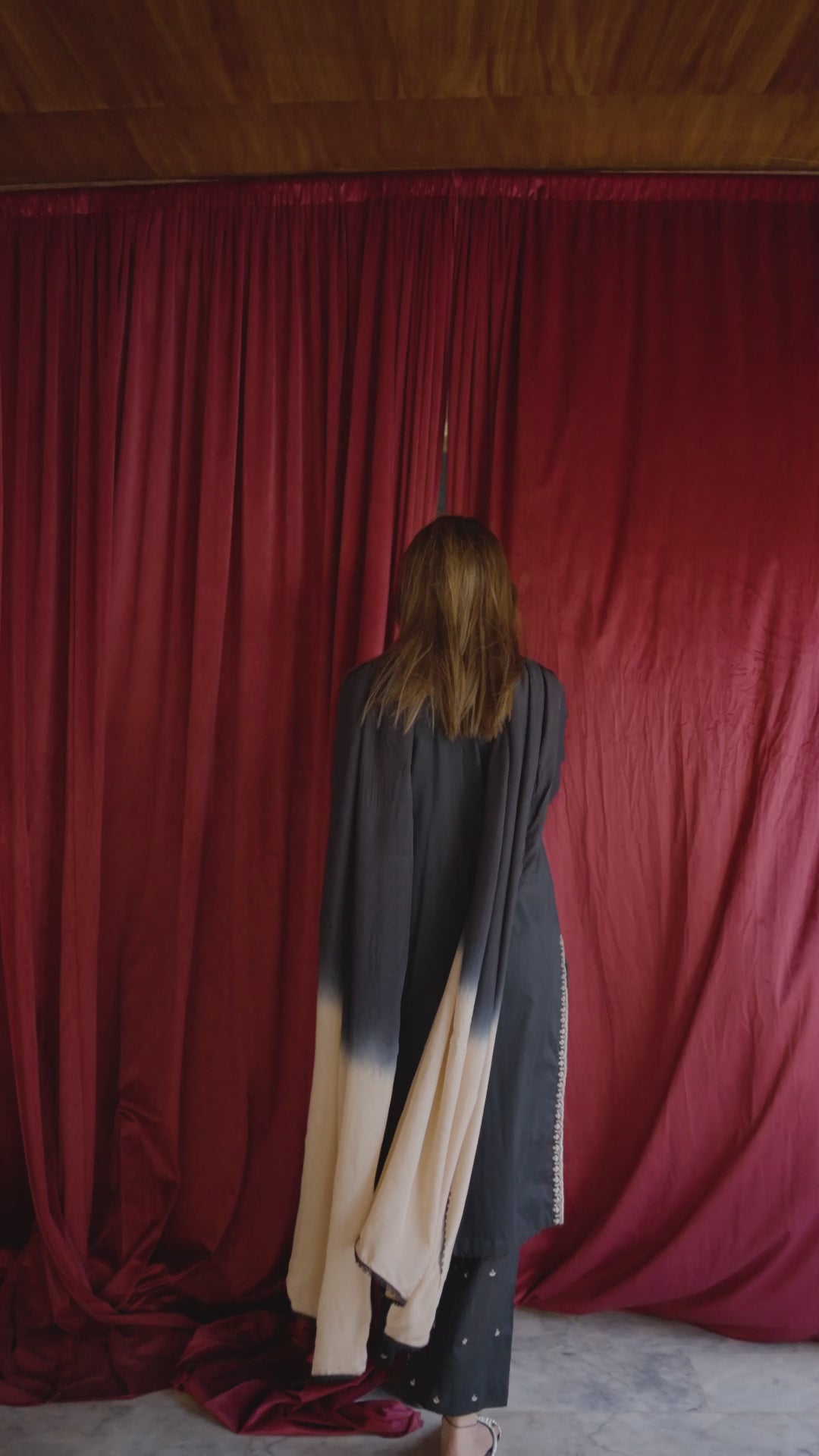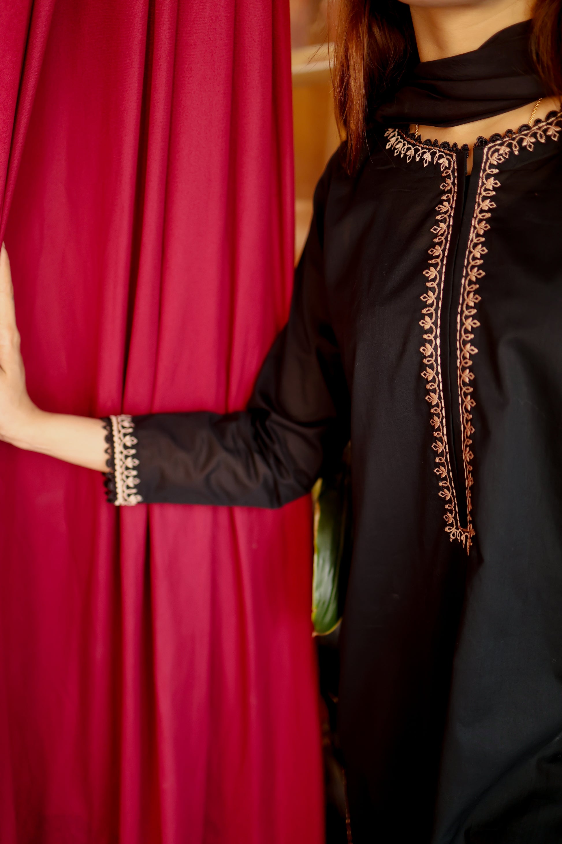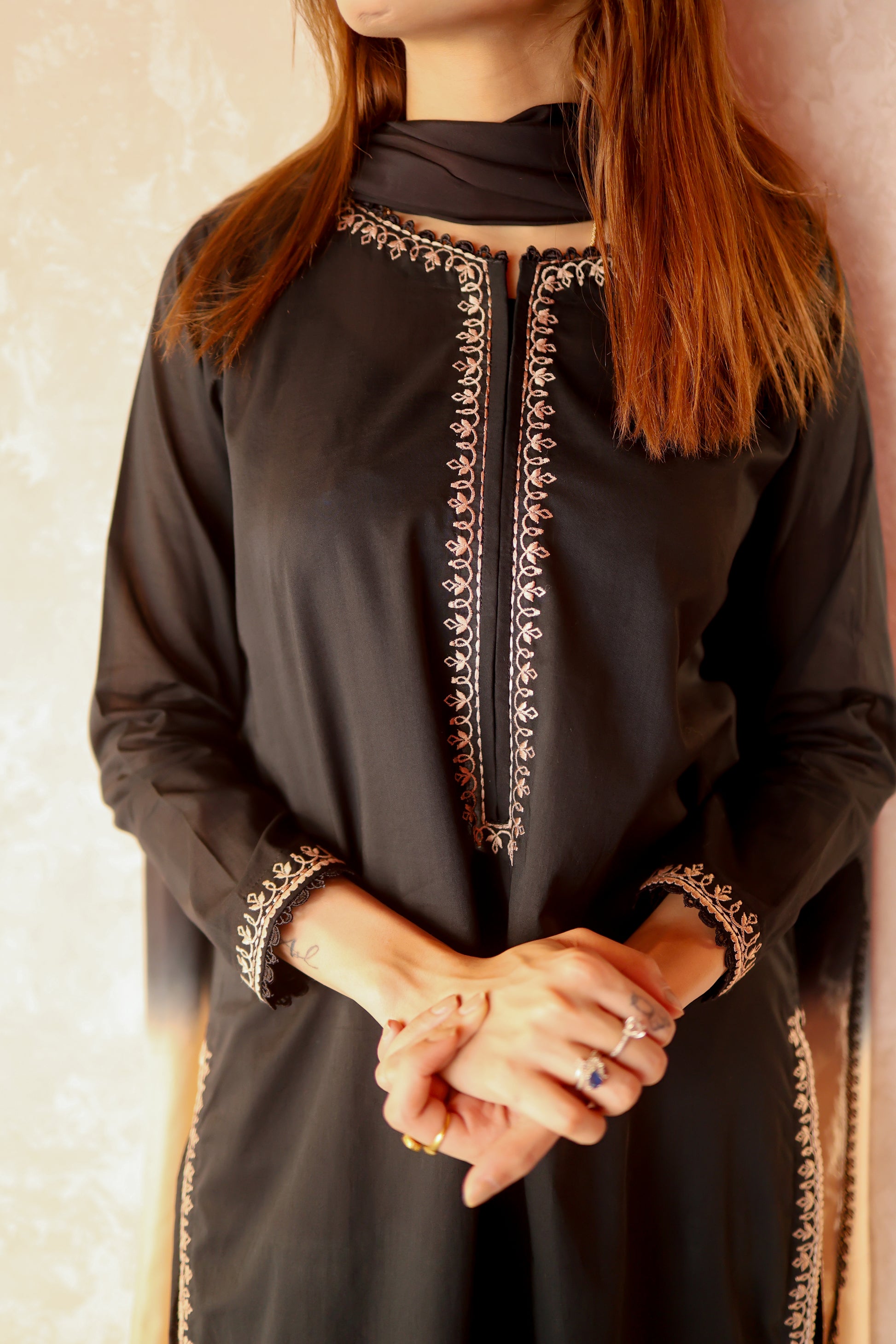 §qTurn heads in our elegant black straight shirt, delicately embroidered along the neckline and sleeves. Crafted from soft Premium Lawn, it's paired with a matching trouser and a tie-dyed medium silk dupatta that adds a vibrant, graceful finish.