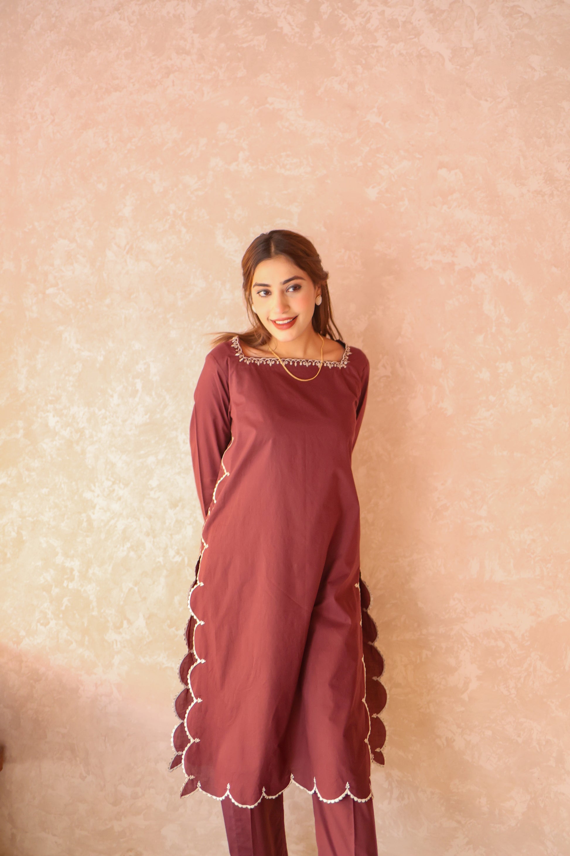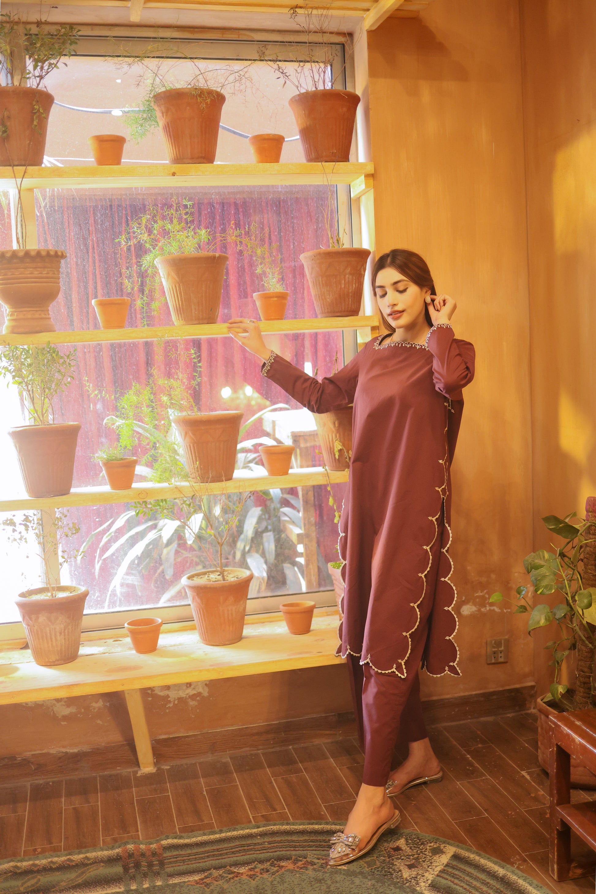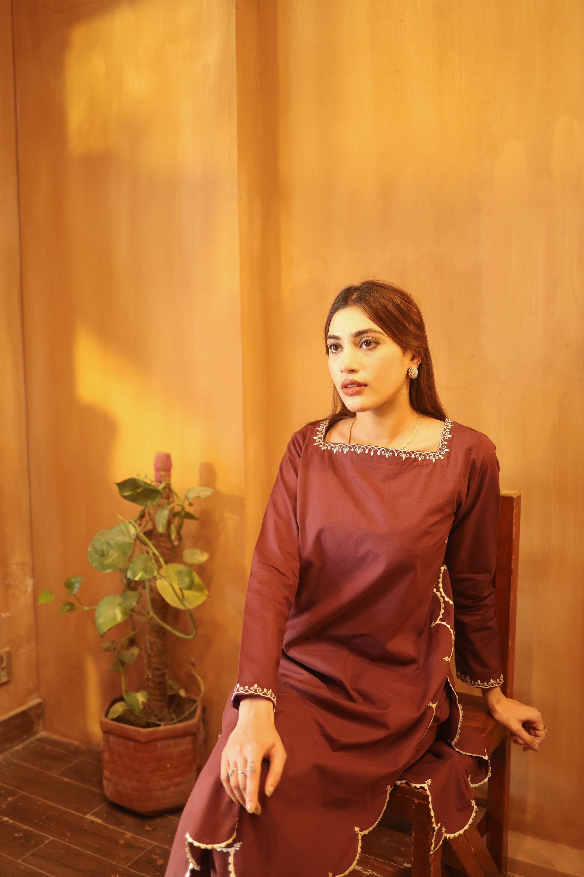 This breezy lawn ensemble is elevated with delicate beige embroidery, tracing graceful scallops and intricate motifs. A statement of timeless charm and refined minimalism – perfect for sun-drenched days and warm evening gatherings.